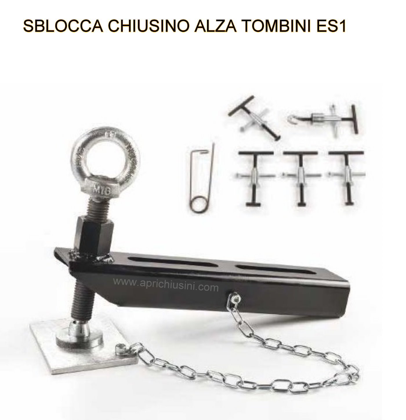 L’utensile va impiegato in combinazione con gli opportuni moretti in dotazione che verrà inserito nell’asola di aggancio del coperchio e bloccato sulla guida regolabile dell’estrattore, la rotazione oraria della vite esercita una grande forza all’insù che rompe le incrostazioni e permette lo sblocco iniziale dei primi millimetri del coperchio che poi sarà sollevabile con i normali i sistemi, la vite viene girata inserendo nell’anello un cacciavite o una leva, il puntone di fulcro che verrà posizionato subito sull’orlo esterno del telaio e sopra la piastrina di base che offre una solida base ed impedisce possibili affondamenti nell’asfalto.